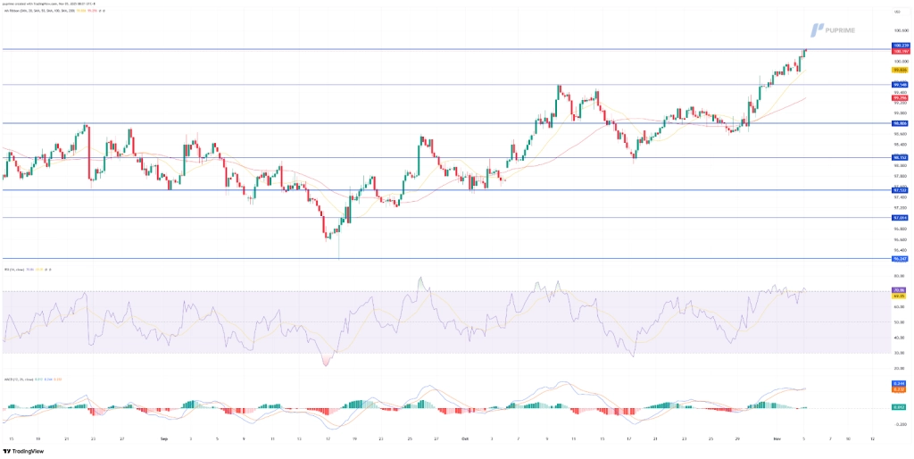 價格走勢仍受到20週期和50週期移動平均線的支撐,這兩條均線均向上傾斜,顯示出持續上漲的動能。相對強弱指數(RSI)已攀升至71附近,顯示美元已進入超買區域,暗示短期內可能出現盤整或小幅回調,之後才會進一步上漲。移動平均收斂/發散指標(MACD)繼續顯示上漲動能,其長條圖為綠色,訊號線也保持金叉。然而,上漲動能似乎略有減弱,顯示在100.20阻力位附近,買盤壓力可能正在減弱。