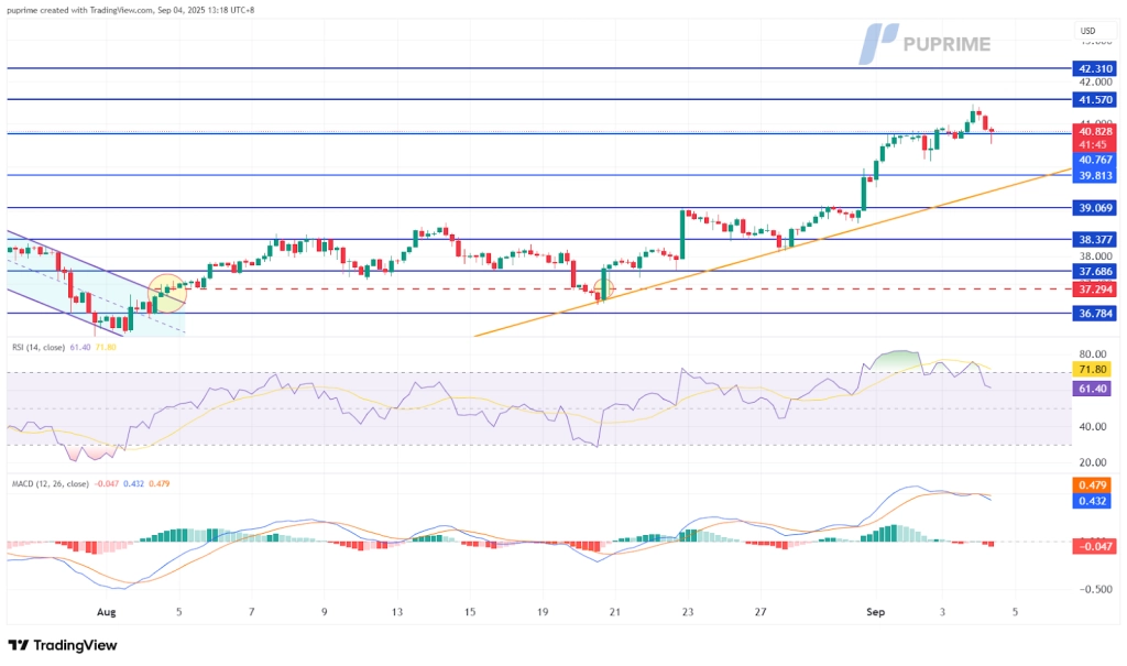 儘管整體趨勢依然完好,但這些技術訊號仍建議謹慎操作。在如此明顯的反彈之後,短期內回調至支撐位(例如先前的歷史高點或上升趨勢線)並非罕見。交易員將密切關注金價能否在當前水平附近盤整以擺脫超買狀態,還是會進一步回調至39.00美元至40.00美元區域。