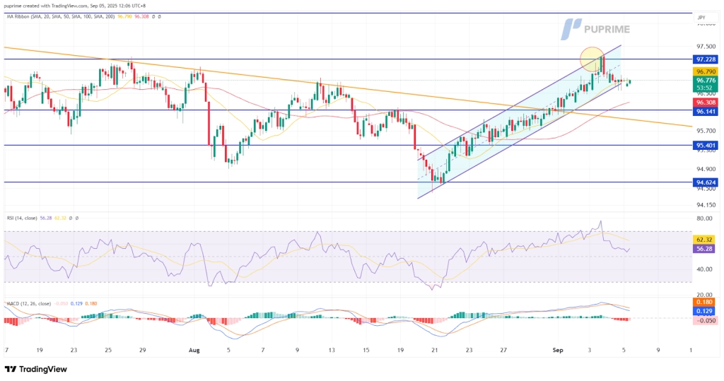 正向的價格結構與減弱的動量訊號之間的對比,增加了近期盤整或回檔的可能性,之後可能再次嘗試突破阻力位。若該貨幣對回落,預計初步支撐位在96.15附近的趨勢線附近,而較重要的支撐位在95.35水準。