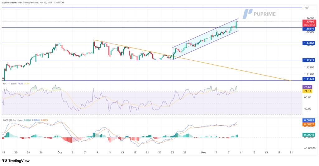 動量指標支持積極的市場前景。相對強弱指數(RSI)持續在超買區域內波動,顯示買盤持續佔據主導地位,但需密切注意潛在的背離跡象。同時,移動平均收斂/發散指標(MACD)在近期出現黃金交叉後,繼續保持零軸上方的多頭姿態。這種技術形態顯示多頭動能依然強勁,支持價格進一步上漲至下一個阻力位(預計在1.0950附近)。