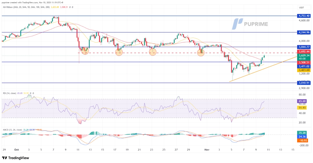 動量指標有力地印證了看漲的結構性轉變。相對強弱指數(RSI)已大幅反彈,並接近超買區域,反映出強勁的買盤需求。同時,移動平均收斂/發散指標(MACD)已形成看漲黃金交叉,並即將上穿零軸。這些技術指標的匯合表明,先前的下跌動能已經消散,支持短期內價格進一步上漲,初步阻力位預計在3,700美元附近。