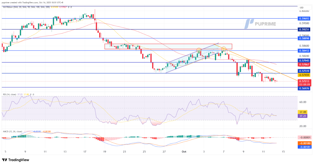 紐元兌美元匯率仍處於明確的看跌軌跡內,始終未能收復0.5850流動性區域上方的關鍵支撐位。隨後形成的低高價格形態強化了當前的下行趨勢,預示著持續的拋售壓力。