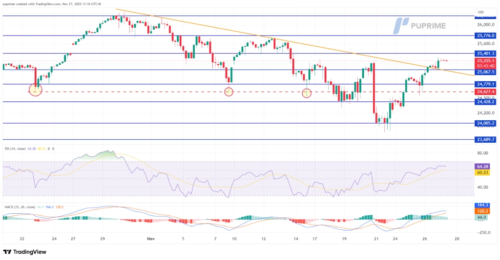 成功突破此關鍵阻力位(此前該阻力位曾多次被反彈嘗試阻擋),顯示機構投資者信心增強,並可能觸發系統性買入計畫。此次突破為價格進一步上漲奠定了新的技術基礎,下一個重要阻力位預計在26,000點心理關卡附近。