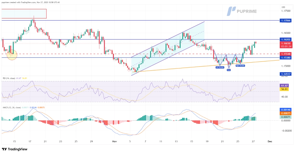 該貨幣對目前面臨下一個重大考驗,即1.1600阻力區。若能有效突破此阻力位,則可望衝擊1.1650目標位;而任何回檔都應在1.1520-1.1540附近的頸線區域獲得支撐。反轉形態的完成與動量指標的增強相吻合,為近期持續上漲奠定了良好的技術基礎。