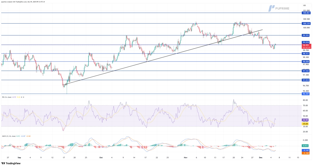 RSI指標已從超賣區域反彈,但仍低於中線,顯示僅出現溫和的修正性反彈,而非強勁的看漲反轉。同時,MACD指標仍處於負值區域,訊號線試圖向上彎曲,但尚未出現確認的金叉,顯示動能依然疲軟。如果空頭壓力再次出現,關鍵支撐位在98.50。整體而言,除非指數能夠重新站上跌破的趨勢線並突破99.60,否則趨勢對賣方有利。