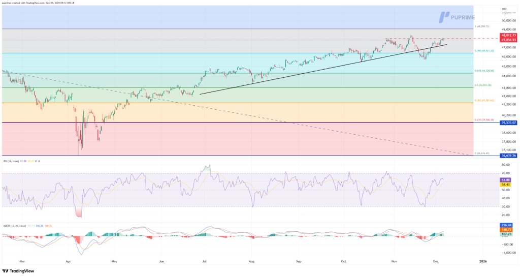 道瓊指數在圖表上持續小幅走高,維持著良好的上升趨勢,價格牢牢守住自10月低點以來形成的上升趨勢線。近期交易日顯示,該指數正緩慢逼近關鍵阻力位48,000美元,該區域此前曾限制了上漲空間,如今則成為上漲行情持續的直接屏障。價格走勢已穩定在46,420美元附近的78.6%斐波那契回檔位上方,進一步鞏固了該區域作為當前上漲結構主要支撐位的地位。