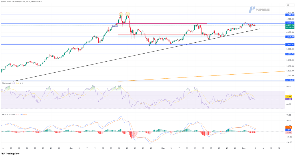 黃金價格在圖表上繼續在其上升趨勢線上方盤整,價格走勢顯示出在11月中旬從3925美元的需求水平強勁反彈後,上漲動能有所放緩的跡象。金價難以突破4,235美元區域,形成一系列小型實體K線,反映出市場在短期阻力位附近猶豫不決。儘管如此,只要價格維持在上升趨勢線上方,整體看漲結構依然完好,該趨勢線自10月以來一直支撐著上漲趨勢。