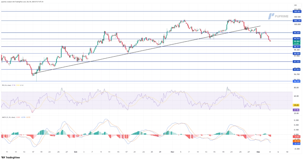 美元指數在圖表上延續了下跌趨勢,果斷跌破了自10月初以來支撐價格的上升趨勢線。這次對結構性支撐的突破標誌著動能的明顯轉變,隨後跌至99.00-98.80區域反映出賣方持續佔據主導地位,下行壓力不斷增加。上週,該指數未能守住99.45的阻力位,在100.25附近形成更低的高點後迅速回落。由於趨勢線目前構成阻力,且價格正向98.50附近的下一個支撐區間下探,除非買方能夠強勢反彈,否則整體前景仍將持續疲軟。