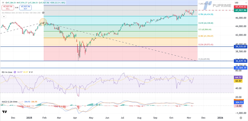 交易者應密切關注47,935 阻力等級——若能果斷突破這一點位,則可能為一波持續上漲行情奠定基礎。49,105反之,如果未能守住目前支撐位,指數可能會回落並再次測試該支撐位。46,435。