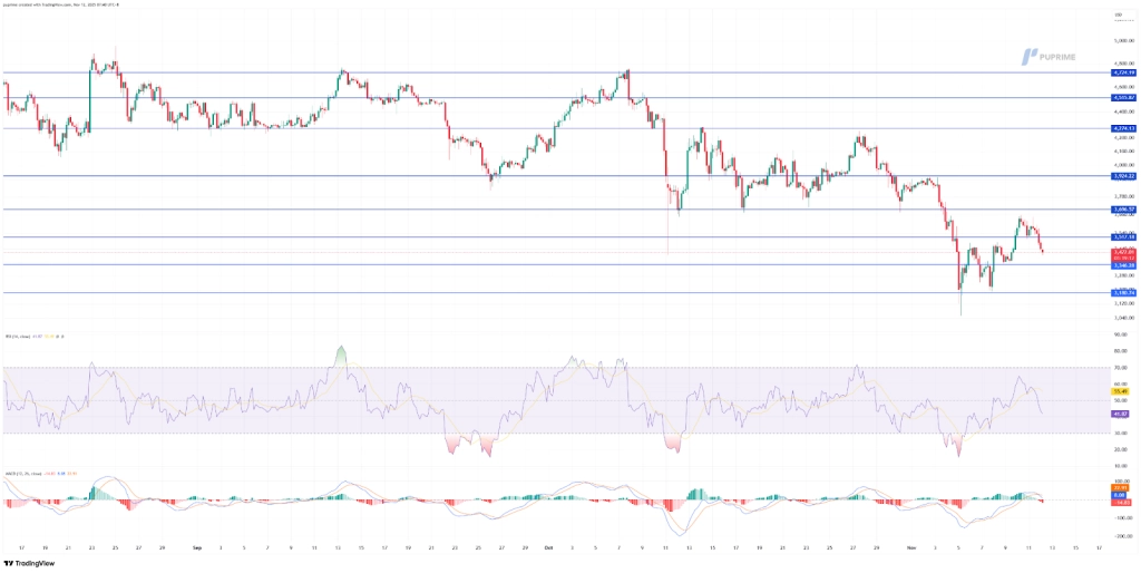 以太坊在未能守住 3,695 美元阻力位後回落,此前該價位在從 3,180 美元短暫反彈後,拋售壓力再次出現。此次受阻表明,以太坊整體下跌趨勢仍然疲軟,目前其交易價格持續低於關鍵阻力位,並處於不斷下移的高點形態中。