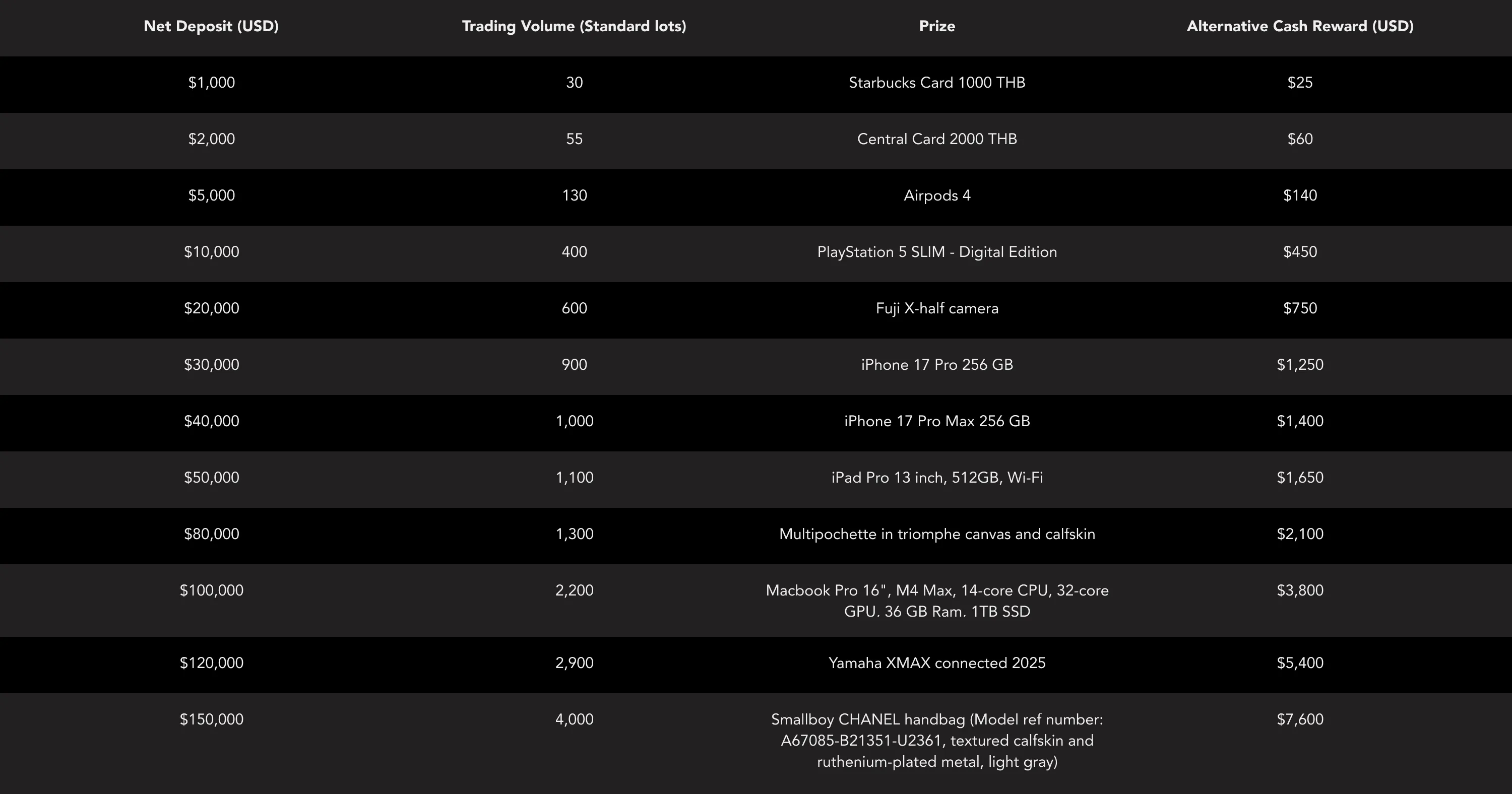 6.During the promotion, clients must meet the required thresholds for both new deposits and trading volume within each tier to qualify for the prize. Clients can apply to receive the corresponding gifts, after the promotion ends. Each client can only redeem one gift.