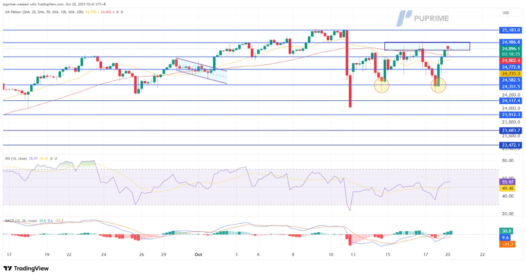 納斯達克綜合指數已建立強勁的技術基礎,在24,300點附近獲得強勁支撐後,形成了清晰的雙底形態。這個反轉結構推動該指數測試了24,985點下方的重要阻力區。