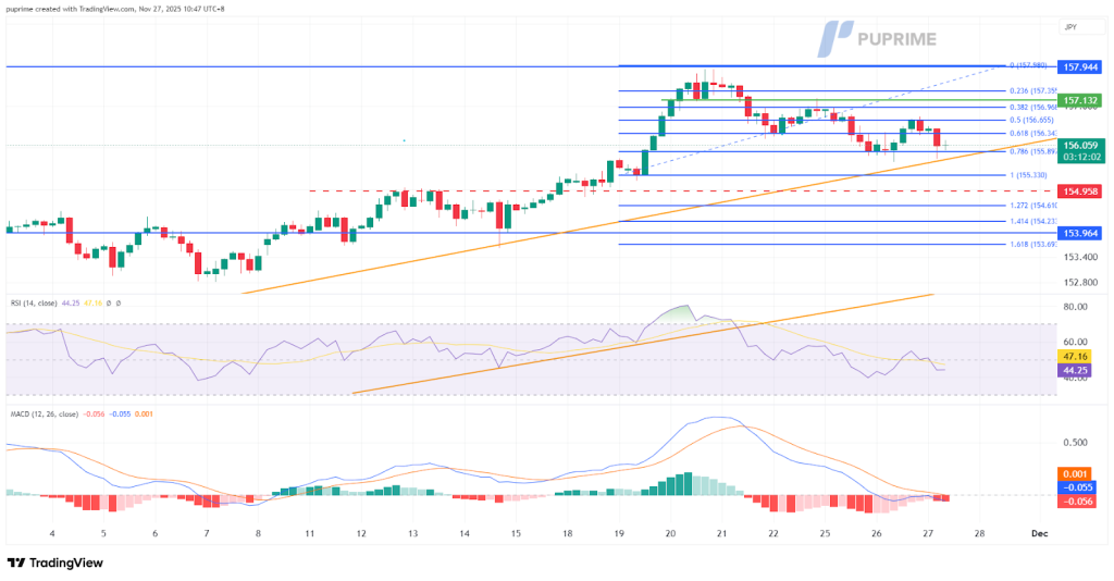 目前的技術面呈現兩種截然不同的走勢。如果價格果斷跌破 155.70,則表示空頭動能仍佔據主導地位,並可能引發價格下探至 154.50 支撐區域。反之,如果成功守住該支撐位並反彈,則將形成三重底形態——一種潛在的強勢反轉形態,可能預示著上漲趨勢的轉變。